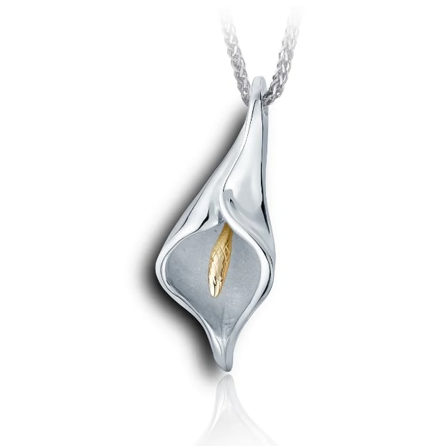 {"id":7668031225919,"title":"Calla Lily 2 tone Cremation Jewelry","handle":"calla-lily-2-tone-cremation-jewelry","description":"\u003cp\u003eHonor your loved one with our exquisite Calla Lily 2 tone Cremation Jewelry. The natural-looking Lily design, sealed with hand made Sterling Silver Screws, makes this a beautiful keepsake for their cremains. Crafted with 2 tone, Sterling Silver and Yellow Gold, this jewelry piece symbolizes the enduring bond you share.\u003c\/p\u003e\n\u003cp\u003eOnce the screw is set flush and tight in the pendant, the threads will bind and stop any elements from passing in or out of the chamber.\u003c\/p\u003e\n\u003cul\u003e\n\u003cli\u003eComes with a 18 inch Italian Sterling Silver Franco style Chain measuring 1.5mm thick. \u003cspan class=\"HwtZe\" lang=\"en\"\u003e\u003cspan class=\"jCAhz ChMk0b\"\u003e\u003cspan class=\"ryNqvb\"\u003eYou can also choose between these other 2 sizes: 20 inch and 24 inch.\u003c\/span\u003e\u003c\/span\u003e\u003c\/span\u003e\u003cbr\u003e\n\u003c\/li\u003e\n\u003cli\u003eIncludes a Sterling Silver Scoop to help fill your pendant.\u003c\/li\u003e\n\u003cli\u003eDimensions: 38mm high x 16mm wide x 10mm deep.\u003c\/li\u003e\n\u003c\/ul\u003e","published_at":"2024-12-18T14:35:32-08:00","created_at":"2024-12-18T14:18:10-08:00","vendor":"Urns.com","type":"Keepsakes and Pendant","tags":["250-500","Between $200 and $500","cremation jewelry for women","cremation-jewelry","material-sterling-silver","theme-nature"],"price":41900,"price_min":41900,"price_max":41900,"available":true,"price_varies":false,"compare_at_price":null,"compare_at_price_min":0,"compare_at_price_max":0,"compare_at_price_varies":false,"variants":[{"id":41359180529727,"title":"18 inch","option1":"18 inch","option2":null,"option3":null,"sku":"UDC-5686","requires_shipping":true,"taxable":true,"featured_image":{"id":32858779353151,"product_id":7668031225919,"position":1,"created_at":"2024-12-18T14:28:19-08:00","updated_at":"2025-05-16T16:30:42-07:00","alt":null,"width":624,"height":624,"src":"\/\/www.urns.com\/cdn\/shop\/files\/UDC-5686.jpg?v=1747438242","variant_ids":[41359180529727,41359180562495,41359180595263]},"available":true,"name":"Calla Lily 2 tone Cremation Jewelry - 18 inch","public_title":"18 inch","options":["18 inch"],"price":41900,"weight":0,"compare_at_price":null,"inventory_management":null,"barcode":null,"featured_media":{"alt":null,"id":25511858012223,"position":1,"preview_image":{"aspect_ratio":1.0,"height":624,"width":624,"src":"\/\/www.urns.com\/cdn\/shop\/files\/UDC-5686.jpg?v=1747438242"}},"requires_selling_plan":false,"selling_plan_allocations":[],"quantity_rule":{"min":1,"max":null,"increment":1}},{"id":41359180562495,"title":"20 inch","option1":"20 inch","option2":null,"option3":null,"sku":"UDC-5686-01","requires_shipping":true,"taxable":true,"featured_image":{"id":32858779353151,"product_id":7668031225919,"position":1,"created_at":"2024-12-18T14:28:19-08:00","updated_at":"2025-05-16T16:30:42-07:00","alt":null,"width":624,"height":624,"src":"\/\/www.urns.com\/cdn\/shop\/files\/UDC-5686.jpg?v=1747438242","variant_ids":[41359180529727,41359180562495,41359180595263]},"available":true,"name":"Calla Lily 2 tone Cremation Jewelry - 20 inch","public_title":"20 inch","options":["20 inch"],"price":41900,"weight":0,"compare_at_price":null,"inventory_management":null,"barcode":null,"featured_media":{"alt":null,"id":25511858012223,"position":1,"preview_image":{"aspect_ratio":1.0,"height":624,"width":624,"src":"\/\/www.urns.com\/cdn\/shop\/files\/UDC-5686.jpg?v=1747438242"}},"requires_selling_plan":false,"selling_plan_allocations":[],"quantity_rule":{"min":1,"max":null,"increment":1}},{"id":41359180595263,"title":"24 inch","option1":"24 inch","option2":null,"option3":null,"sku":"UDC-5686-02","requires_shipping":true,"taxable":true,"featured_image":{"id":32858779353151,"product_id":7668031225919,"position":1,"created_at":"2024-12-18T14:28:19-08:00","updated_at":"2025-05-16T16:30:42-07:00","alt":null,"width":624,"height":624,"src":"\/\/www.urns.com\/cdn\/shop\/files\/UDC-5686.jpg?v=1747438242","variant_ids":[41359180529727,41359180562495,41359180595263]},"available":true,"name":"Calla Lily 2 tone Cremation Jewelry - 24 inch","public_title":"24 inch","options":["24 inch"],"price":41900,"weight":0,"compare_at_price":null,"inventory_management":null,"barcode":null,"featured_media":{"alt":null,"id":25511858012223,"position":1,"preview_image":{"aspect_ratio":1.0,"height":624,"width":624,"src":"\/\/www.urns.com\/cdn\/shop\/files\/UDC-5686.jpg?v=1747438242"}},"requires_selling_plan":false,"selling_plan_allocations":[],"quantity_rule":{"min":1,"max":null,"increment":1}}],"images":["\/\/www.urns.com\/cdn\/shop\/files\/UDC-5686.jpg?v=1747438242"],"featured_image":"\/\/www.urns.com\/cdn\/shop\/files\/UDC-5686.jpg?v=1747438242","options":["Chain size"],"media":[{"alt":null,"id":25511858012223,"position":1,"preview_image":{"aspect_ratio":1.0,"height":624,"width":624,"src":"\/\/www.urns.com\/cdn\/shop\/files\/UDC-5686.jpg?v=1747438242"},"aspect_ratio":1.0,"height":624,"media_type":"image","src":"\/\/www.urns.com\/cdn\/shop\/files\/UDC-5686.jpg?v=1747438242","width":624}],"requires_selling_plan":false,"selling_plan_groups":[],"content":"\u003cp\u003eHonor your loved one with our exquisite Calla Lily 2 tone Cremation Jewelry. The natural-looking Lily design, sealed with hand made Sterling Silver Screws, makes this a beautiful keepsake for their cremains. Crafted with 2 tone, Sterling Silver and Yellow Gold, this jewelry piece symbolizes the enduring bond you share.\u003c\/p\u003e\n\u003cp\u003eOnce the screw is set flush and tight in the pendant, the threads will bind and stop any elements from passing in or out of the chamber.\u003c\/p\u003e\n\u003cul\u003e\n\u003cli\u003eComes with a 18 inch Italian Sterling Silver Franco style Chain measuring 1.5mm thick. \u003cspan class=\"HwtZe\" lang=\"en\"\u003e\u003cspan class=\"jCAhz ChMk0b\"\u003e\u003cspan class=\"ryNqvb\"\u003eY