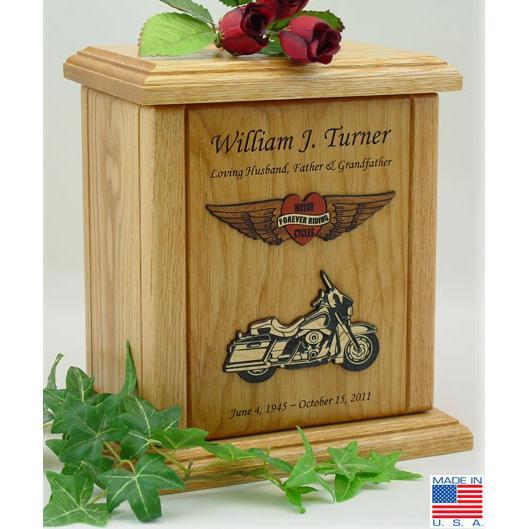 Crafted with pride in the USA, the Motorcycle Wood Urn is made of a combination of Red Alder and Red Oak. With a smooth surface, makes a wonderful background for the embossing of the motorcycle artwork for your loved one. Different wood types are used to create the dimensional artwork that includes a heart, and engraving of the name, dates and sentimental phrase are included. The motorcycle wood urns are bottom sealed with 4 brass screws and have pads to protect furniture.