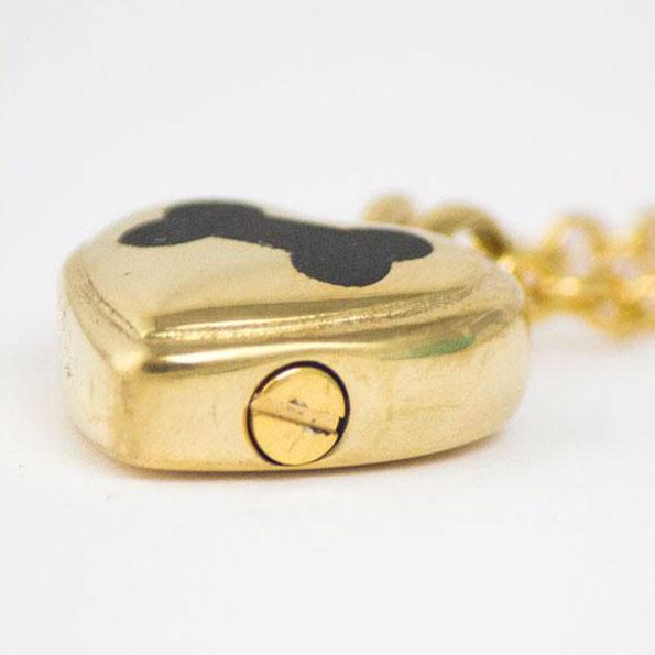 The Dog Bone Heart Stainless Steel Cremation Pendant is made in the shape of a heart and with the material gold plated stainless steel. In the center of the heart it has the silhouette of a bone.