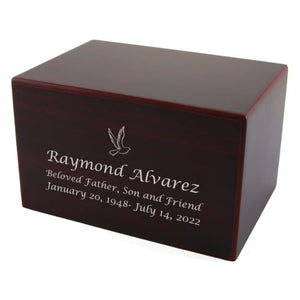 Elegant, simple and affordable, the Medium Density Fiberboard Urn has a brilliant Cherry finish. This adult urn offers both text engraving as well as art engraving for a more personalized touch, starting at $15, and has a bottom opening that opens and closes with four screws.