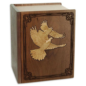 A Book shaped Wood Companion Urn with Doves on the Cover. Is an inspirational wooden companion urn. The Doves always reflecting peace and this one is beautifully crafted in the USA and a wonderful way to honor your loved ones.