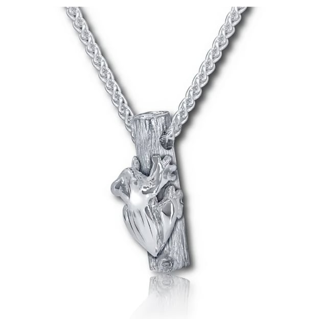 Keep the memory of your loved one close to your heart with our Tree Frog Cremation Jewelry. This delicate pendant, crafted with Sterling Silver and small details, features a frog standing on a log and provides a small place for cremains. Sealed with hand made Sterling Silver screws, this piece will help you remember your special person in a beautiful and different way.