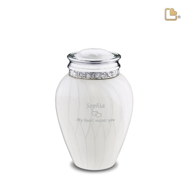 {"id":1732408246335,"title":"Blessing Pearl Silver Infant Urn","handle":"blessin-pearl-silver-infant-urn","description":"\u003cp\u003eAn Infant urn part of the Pearl Blessing Solid Brass Urns Collection, a one of a kind child urn to remember your loved one. Finished in a wonderful pearlescent sheen that catches beautifully in the light.\u003c\/p\u003e\n\u003cp\u003eThreaded top lid that matches the body of the urn itself, completing the look.\u003c\/p\u003e\n\u003cul\u003e\n\u003cli\u003eDimensions: 4.33\" W x 6.5\" H, Capacity: 49 cubic inches\u003cbr\u003e\n\u003c\/li\u003e\n\u003cli\u003eCustomize your urn by adding a clip art and\/or up three lines of text, starting at only $49\u003c\/li\u003e\n\u003cli\u003e\n\u003cspan\u003eOpening: Threaded Top\u003c\/span\u003e\u003cbr\u003e\n\u003c\/li\u003e\n\u003cli\u003e\u003cspan\u003eComes with: Presentation Pouch\u003cbr\u003e\u003c\/span\u003e\u003c\/li\u003e\n\u003c\/ul\u003e\n\u003cp\u003e\u003cbr\u003e\u003c\/p\u003e\n\u003cul\u003e\u003c\/ul\u003e","published_at":"2018-04-02T17:04:15-07:00","created_at":"2019-03-18T13:49:46-07:00","vendor":"Urns.com","type":"Blessing Solid Brass Urns","tags":["100-250","Art_Engraving_Love_Urns","Between $100 and $200","customization","infant-urns","Love Urns 3-30","material-solid-brass"],"price":11900,"price_min":11900,"price_max":18400,"available":true,"price_varies":true,"compare_at_price":null,"compare_at_price_min":0,"compare_at_price_max":0,"compare_at_price_varies":false,"variants":[{"id":14409769844799,"title":"No \/ No","option1":"No","option2":"No","option3":null,"sku":"udc-4623","requires_shipping":true,"taxable":true,"featured_image":{"id":34164260175935,"product_id":1732408246335,"position":1,"created_at":"2025-07-03T09:49:29-07:00","updated_at":"2025-08-25T08:15:44-07:00","alt":null,"width":624,"height":624,"src":"\/\/www.urns.com\/cdn\/shop\/files\/udc-4623_c314b951-7d08-4326-a23b-51cb5d5e7b84.jpg?v=1756134944","variant_ids":[14409769844799]},"available":true,"name":"Blessing Pearl Silver Infant Urn - No \/ No","public_title":"No \/ No","options":["No","No"],"price":11900,"weight":0,"compare_at_price":null,"inventory_management":null,"barcode":null,"featured_media":{"alt":null,"id":26353197875263,"position":1,"preview_image":{"aspect_ratio":1.0,"height":624,"width":624,"src":"\/\/www.urns.com\/cdn\/shop\/files\/udc-4623_c314b951-7d08-4326-a23b-51cb5d5e7b84.jpg?v=1756134944"}},"requires_selling_plan":false,"selling_plan_allocations":[],"quantity_rule":{"min":1,"max":null,"increment":1}},{"id":14409769877567,"title":"No \/ Yes","option1":"No","option2":"Yes","option3":null,"sku":"udc-4623-01","requires_shipping":true,"taxable":true,"featured_image":{"id":31206376046655,"product_id":1732408246335,"position":6,"created_at":"2024-02-06T14:55:48-08:00","updated_at":"2025-08-25T08:15:44-07:00","alt":null,"width":624,"height":624,"src":"\/\/www.urns.com\/cdn\/shop\/files\/FONTS-LOVE-URNS_NEW_d516bacf-fde2-4e0c-b0d4-fd59abbc1292.jpg?v=1756134944","variant_ids":[14409769877567,14409769910335]},"available":true,"name":"Blessing Pearl Silver Infant Urn - No \/ Yes","public_title":"No \/ Yes","options":["No","Yes"],"price":16800,"weight":0,"compare_at_price":null,"inventory_management":null,"barcode":null,"featured_media":{"alt":null,"id":24049866670143,"position":6,"preview_image":{"aspect_ratio":1.0,"height":624,"width":624,"src":"\/\/www.urns.com\/cdn\/shop\/files\/FONTS-LOVE-URNS_NEW_d516bacf-fde2-4e0c-b0d4-fd59abbc1292.jpg?v=1756134944"}},"requires_selling_plan":false,"selling_plan_allocations":[],"quantity_rule":{"min":1,"max":null,"increment":1}},{"id":14409769910335,"title":"Yes \/ No","option1":"Yes","option2":"No","option3":null,"sku":"udc-4623-02","requires_shipping":true,"taxable":true,"featured_image":{"id":31206376046655,"product_id":1732408246335,"position":6,"created_at":"2024-02-06T14:55:48-08:00","updated_at":"2025-08-25T08:15:44-07:00","alt":null,"width":624,"height":624,"src":"\/\/www.urns.com\/cdn\/shop\/files\/FONTS-LOVE-URNS_NEW_d516bacf-fde2-4e0c-b0d4-fd59abbc1292.jpg?v=1756134944","variant_ids":[14409769877567,14409769910335]},"available":true,"name":"Blessing Pearl Silver Infant Urn - Yes \/ No","public_title":"Yes \/ No","options":["Yes","No"],"price":16800,"weight":0,"compare_at_price":null,"inventory_management":null,"barcode":null,"featured_media":{"alt":null,"id":24049866670143,"position":6,"preview_image":{"aspect_ratio":1.0,"height":624,"width":624,"src":"\/\/www.urns.com\/cdn\/shop\/files\/FONTS-LOVE-URNS_NEW_d516bacf-fde2-4e0c-b0d4-fd59abbc1292.jpg?v=1756134944"}},"requires_selling_plan":false,"selling_plan_allocations":[],"quantity_rule":{"min":1,"max":null,"increment":1}},{"id":14409769943103,"title":"Yes \/ Yes","option1":"Yes","option2":"Yes","option3":null,"sku":"udc-4623-03","requires_shipping":true,"taxable":true,"featured_image":{"id":31206393151551,"product_id":1732408246335,"position":14,"created_at":"2024-02-06T14:58:26-08:00","updated_at":"2025-08-25T08:15:44-07:00","alt":null,"width":624,"height":624,"src":"\/\/www.urns.com\/cdn\/shop\/files\/Tadblu-clipart_55008e77-7470-486d-9c30-e2c57c7cad64.jpg?v=1756134944","variant_ids":[14409769943103]},"available":true,"name":"Blessing Pearl Silver Infant Urn - Yes \/ Yes","public_title":"Yes \/ Yes","options":["Yes","Yes"],"price":18400,"weight":0,"compare_at_price":null,"inventory_management":null,"barcode":null,"featured_media":{"alt":null,"id":24049883840575,"position":14,"preview_image":{"aspect_ratio":1.0,"height":624,"width":624,"src":"\/\/www.urns.com\/cdn\/shop\/files\/Tadblu-clipart_55008e77-7470-486d-9c30-e2c57c7cad64.jpg?v=1756134944"}},"requires_selling_plan":false,"selling_plan_allocations":[],"quantity_rule":{"min":1,"max":null,"increment":1}}],"images":["\/\/www.urns.com\/cdn\/shop\/files\/udc-4623_c314b951-7d08-4326-a23b-51cb5d5e7b84.jpg?v=1756134944","\/\/www.urns.com\/cdn\/shop\/files\/UDC-4623a.jpg?v=1756134944","\/\/www.urns.com\/cdn\/shop\/files\/UDC-4623b.jpg?v=1756134944","\/\/www.urns.com