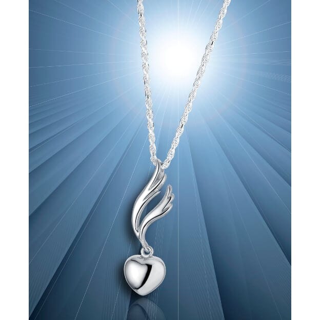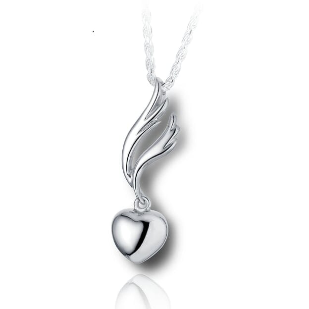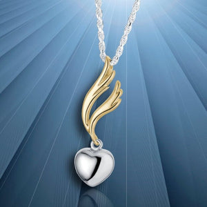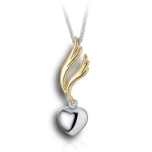 Keep your loved one's memories close to your heart with this lovely and delicate Angel Wing with Heart Cremation pendant. This beautiful cremation jewelry comes in two versions, one sterling silver and sterling silver with 10K gold angel wings.