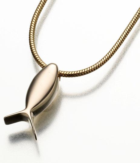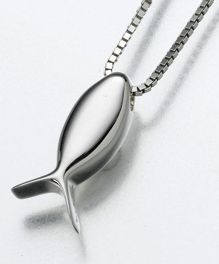 Fish Keepsake Urn in sterling silver, gold vermeil or 14K gold. Ashes are added through a screw back opening. A layer of silicone has been applied to each cremation jewelry pendant, to avoid tarnishing. Each cremation jewelry Includes an attractive black velvet gift box, glue, care card, filling funnel and instructions, screw driver (if needed).