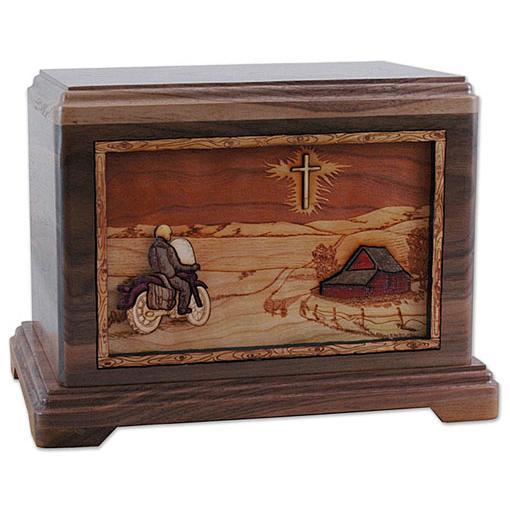If your loved one was a motorcycle rider, this motorcycle wood urn is the perfect one. Made in the US in Maple, Oak or Walnut, the image on the urn is inlaid wood and it has up to seven different kinds of hardwood at four different levels. (Shown in Walnut) Size: 10 x 7 x 7 " H Capacity: 210 Cubic Inches.