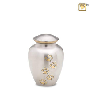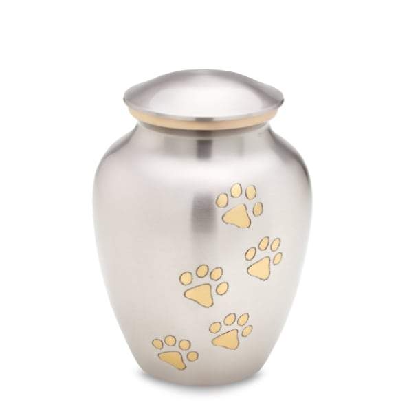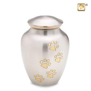 Honor the life of your beloved pet with this stunning Classic Pewter Pet Urn. Gold hand engraved paw prints walk up the front of this urn set against a pewter background.
