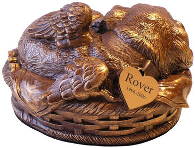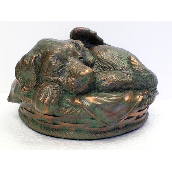 The little puppy is sleeping cozy in a basket. The Bronze Green Patina Finish puppy is detailed throughout and is made of resin. The urn is bottom loading with a plastic plug and a felt bottom to protect furniture. Measures approximately 7.5 x 6.5 x 4.5 inches, and the capacity is 55 cubic inches. A Personally engraved heart paste-on name tag is optional.