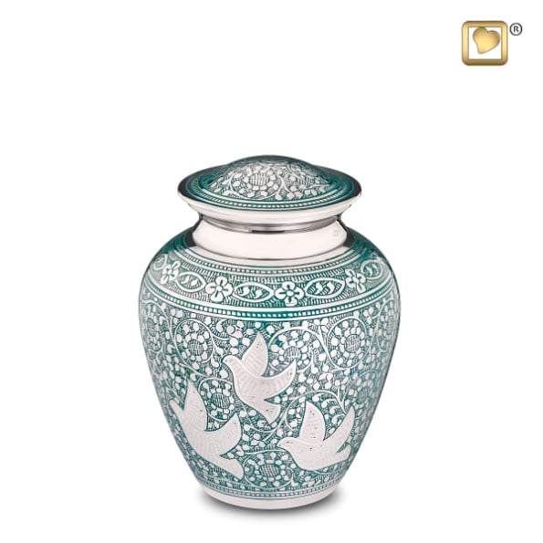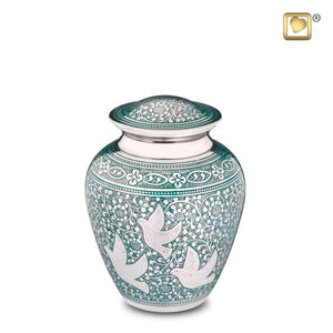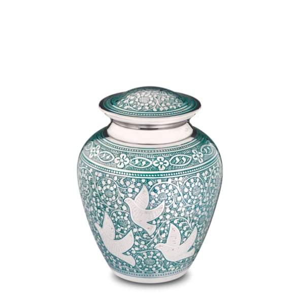 Three birds flying above toward the clouds on this unique exquisite Going Home Infant Solid Brass Cremation Urn. A distinct vase shape sets this infant urn apart and a sense of tranquility washes over you when you watch at the birds flying over hand engraved teal blue swirls and flower inlays.