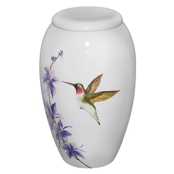 The Hummingbird Delight Adult Urn is painted with a beautiful Hummingbird flying over some flowers to collect its food. With vivid colors on a white background, this adult urn in addition to transmitting peace and joy becomes a very special place where you can keep the ashes of your loved one who is no longer with you.