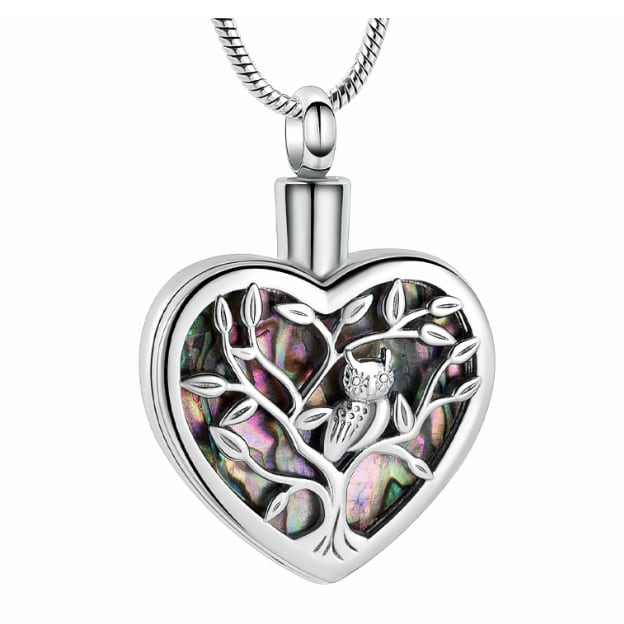 This cremation pendant is made of stainless steel in the shape of a heart, embellished with a sparkling clear stone, mounted over an abalone background. And there is an owl sitting on the cremation pendant.