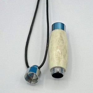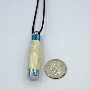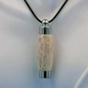 The findings are made of chrome and the dimensions of the pendant are 2 3/8 inches long and 3/4 inches in diameter. The Pendant unscrews from the top. You can fill this pendant with dried flowers, ashes, a lock of hair, etc. The antler is sanded to 1500 grit sand paper.