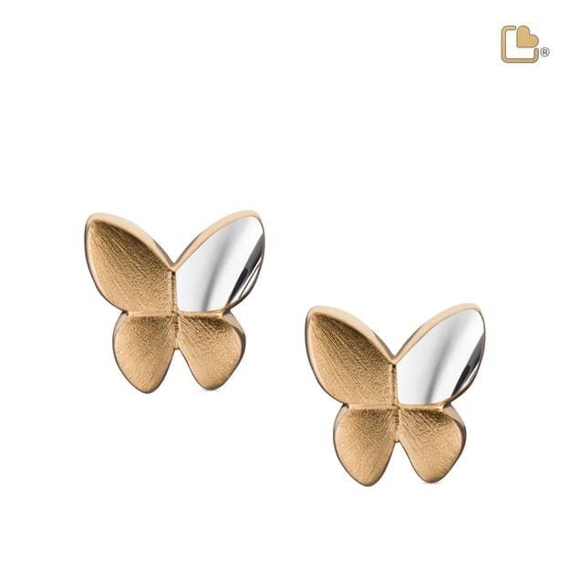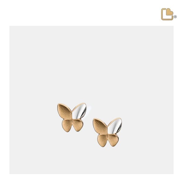 Die Ohrstecker Butterfly Gold Vermeil Two Tone sind ein attraktives Accessoire, das zu jeder Kleidung passt, insbesondere zu Trauerfeiern. Das einzigartige Design und der erschwingliche Preis sind das Alleinstellungsmerkmal. Die Ohrringe enthalten keine sterblichen Überreste, sondern sind lediglich ein passendes Schmuckstück zum Kremationsanhänger.