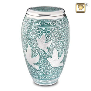 Handgravierte türkisgrüne Emaille unterstreicht das darunter liegende glänzende Zinn. Diese Urne für Erwachsene wäre ein wunderschöner Ruheplatz für alle, die die Natur lieben und die vorbeifliegenden Vögel beobachten möchten.