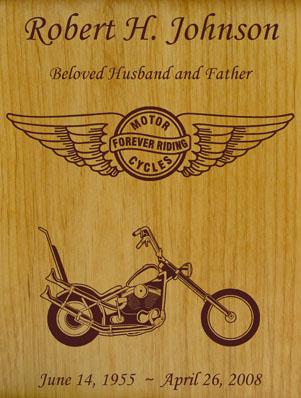 Las urnas de madera para motocicletas están hechas de una combinación de aliso rojo y roble rojo. Esta madera tiene una superficie lisa y constituye un hermoso fondo para grabar la obra de arte de la motocicleta para su ser querido. Se incluye grabado del nombre, fechas y frase sentimental. Las urnas están selladas en el fondo con 4 tornillos de latón y tienen almohadillas para proteger los muebles.