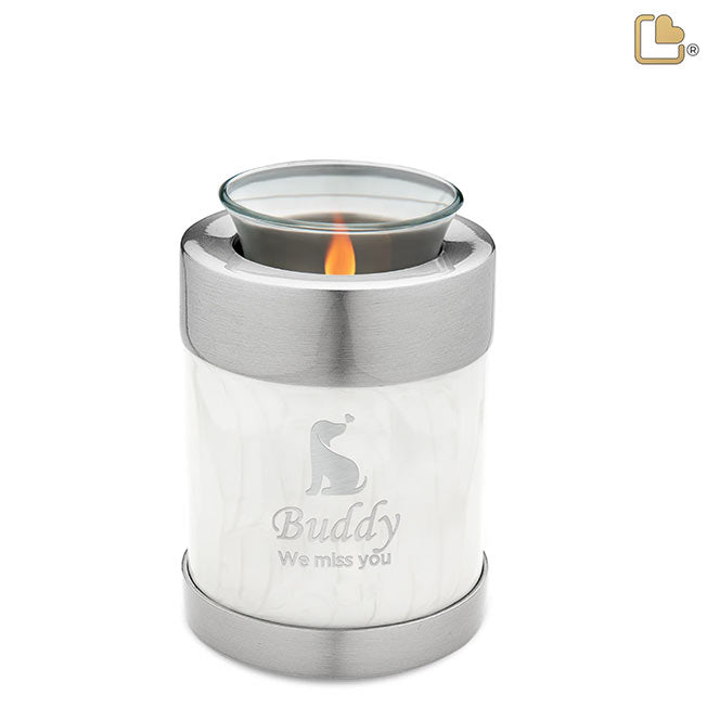 Huellas de patas grabadas en una impresionante vela de té perlada para mascotas. Las huellas se deslizan solas por el frente de esta hermosa urna perlada para mascotas, con forma de vela de té. Recubierta con un acabado brillante, esta urna de latón macizo para mascotas está hecha para durar.
