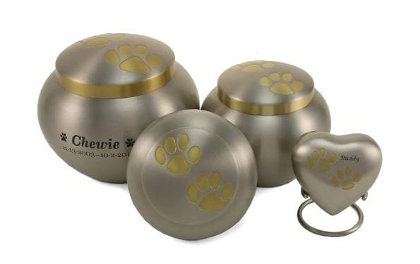 White heart-shaped solid brass pet urn with paw prints—keepsake urn for dog ashes or cat urns for ashes, premium pet memorial gift and small urn for ashes from Urns.com.