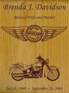 Born to Ride, ese podría haber sido tu ser querido, y qué mejor manera de recordar esos recuerdos que una urna de madera de motocicleta, hecha de una combinación de Red Alder y Red Oak. Se trata de una madera de superficie lisa y constituye un hermoso fondo para grabar la obra de arte de la motocicleta para su ser querido. Se incluye grabado del nombre, fechas y frase sentimental. Las urnas están selladas en el fondo con 4 tornillos de latón y tienen almohadillas para proteger los muebles.