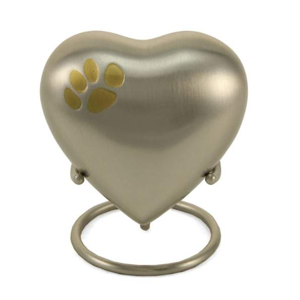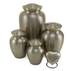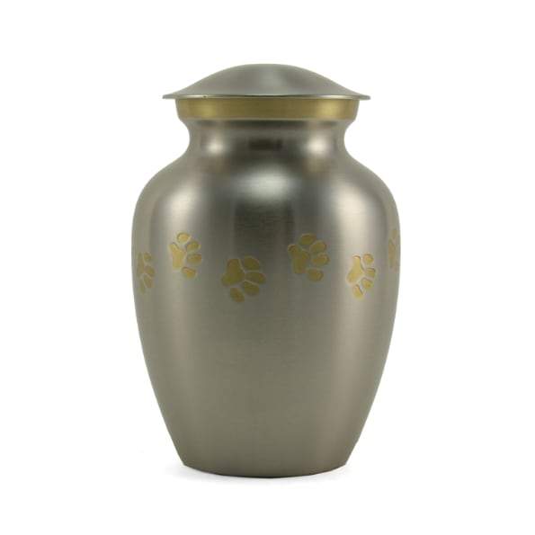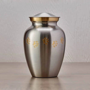 Esta urna para mascotas de latón macizo tiene un acabado de peltre y un borde dorado alrededor de la tapa a juego con las huellas de las patas. Es una excelente manera de honrar a su querida mascota.