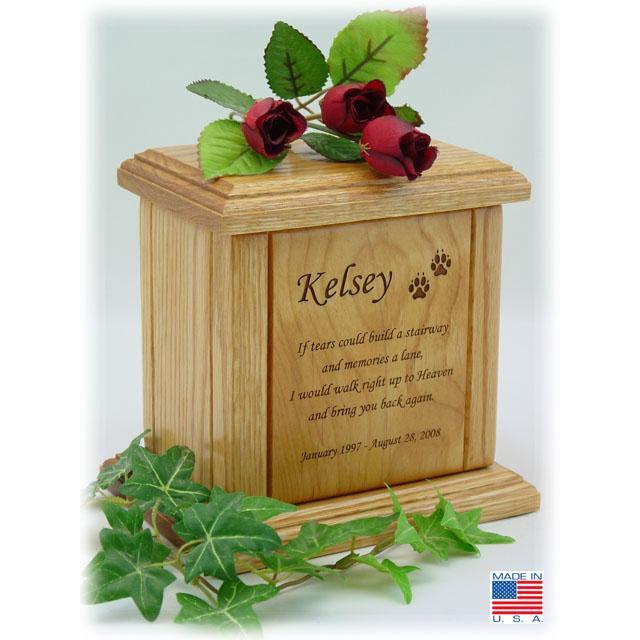This series of poem pet urns in wood has a small/medium size, crafted with pride in the USA. This wood pet urn comes with a poem engraved on it, and the Memorial Poem Pet Wood Urns are made of Red Alder.