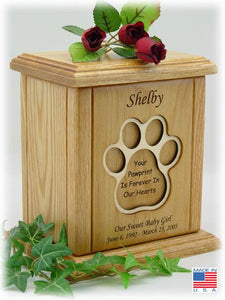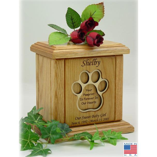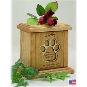 The Recessed Paw Print Pet Urns are solid wood pet cremation urns for dogs and cats. These wood pet urns include a maple recessed or embossed paw print with the inscription "Your Pawprint Is Forever In Our Hearts" along with the name of your pet, sentiment and dates. The Recessed Paw Print Urn is a combination of select grade solid red oak and red alder wood. The Pawprint Urns are available in four sizes.