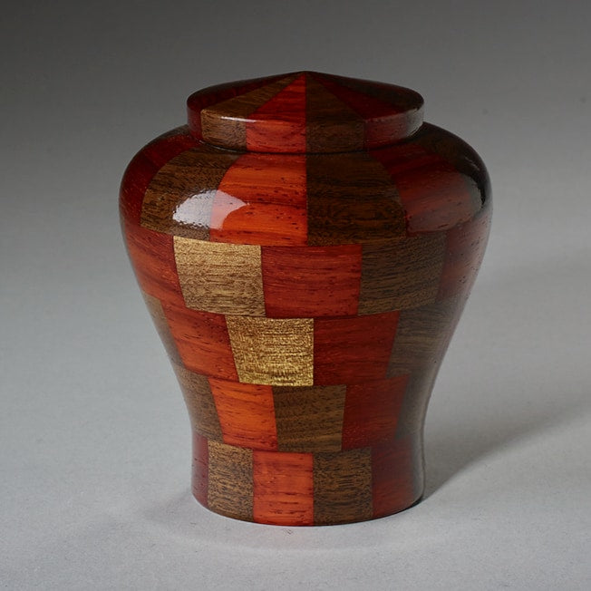 Wooden Keepsake artistically hand- crafted by segmented multiple pieces of natural woods together, hand-turning them, and sealing them with a urethane finish polished to a glass-like shine. This Wooden Keepsake is a genuine integration of nature's best offerings. It is composed of Padauk and Black Walnut woods that are harmoniously assembled.