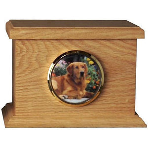 Wood Pet Urns beautifully crafted in the USA. These Wooden pet urns come in Oak, Dark Oak, Walnut, Cherry and Maple. You may choose one with or without a photo bezel to place the picture of your beloved pet. (Urn shown in oak) Dimensions: 8 1/4" W x 6 1/4" D x 5 3/4" H Capacity: pets up to 80 lbs You may also add a Nameplate to personalize your pet urn